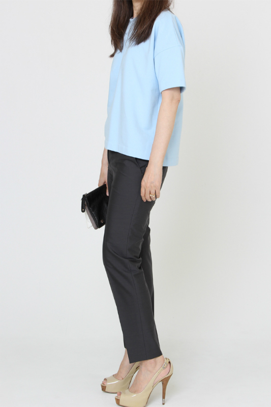 ・ドロップショルダーで着るシルエット。身幅はボクシーで袖口は細くなっています。